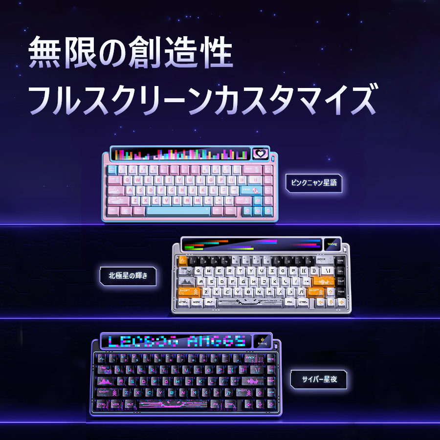 デュアルスクリーン搭載、RGB、そして最適化された内部構造。「AMG65」は単なる入力デバイスとしての枠組みを超え、高いカスタマイズ性のよる「自分専用キーボード」を叶えます。オフィスワークからゲーミング、個性を反映したデスクセットアップまで、あらゆるシーンに最適です。