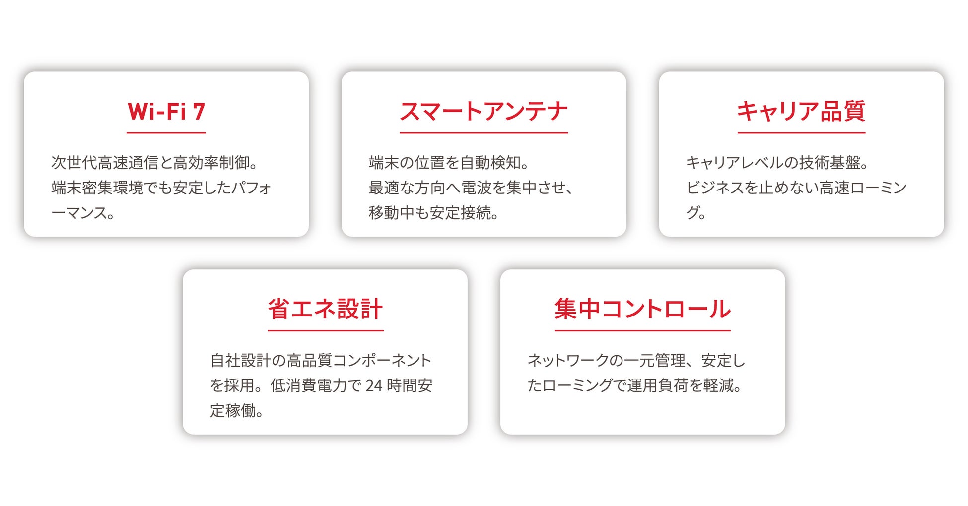 eKitは、現場での使いやすさと高度な無線技術を両立する次世代ネットワークソリューションです。主な特長は、高速・大容量通信を実現する「Wi-Fi 7」、安定した接続を支える「スマートアンテナ」、業務利用に求められる信頼性を備えた「キャリア品質」、継続運用を支える「省エネ設計」、そして運用負荷を抑える「集中コントロール」の5点です。これらの特長により、eKit はホテルや小売、オフィスなど、現場の実務ニーズに応える使いやすく信頼性の高いネットワーク基盤を提供可能です。