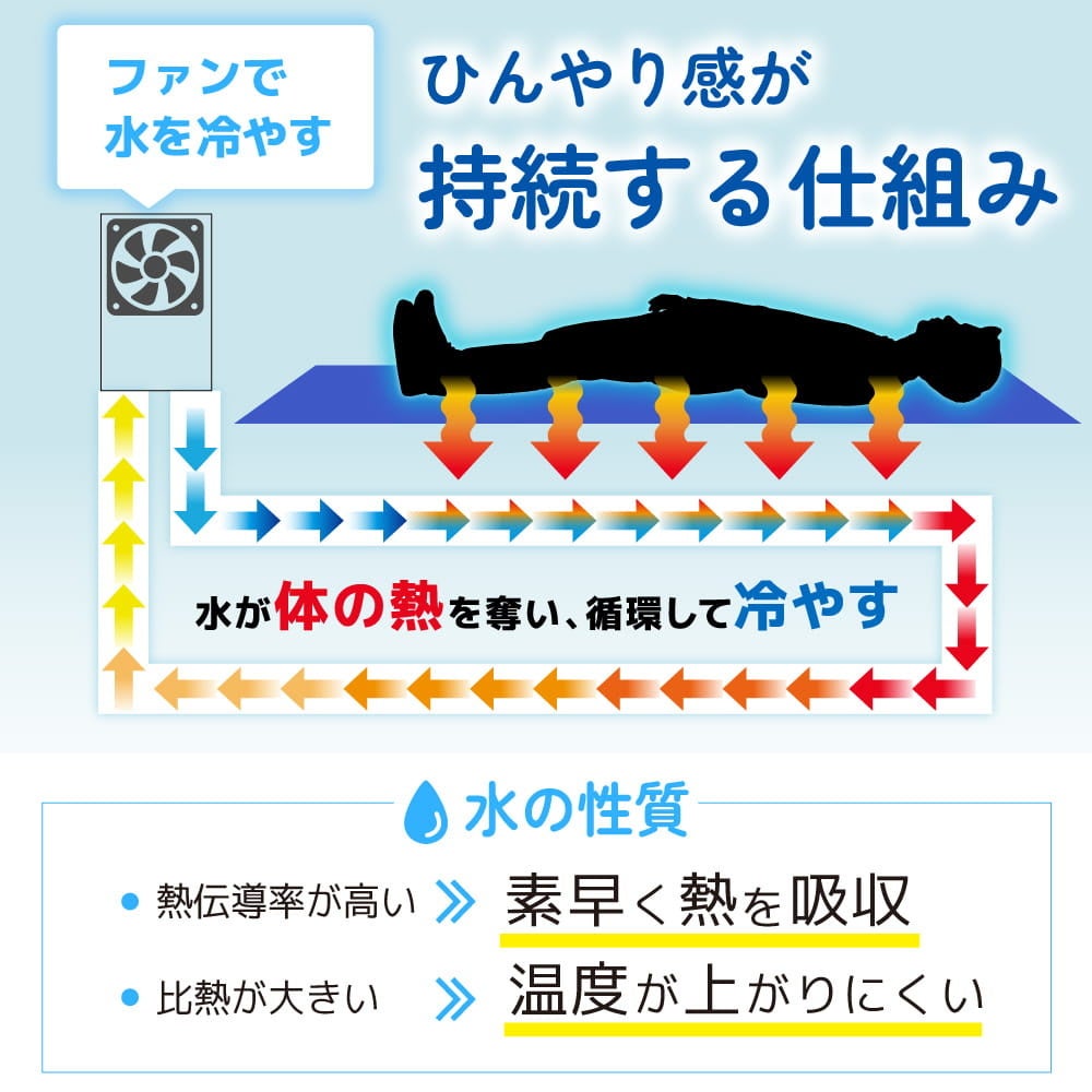 本製品は、マット内部に水を循環させて冷やす水冷式の冷感マットです。