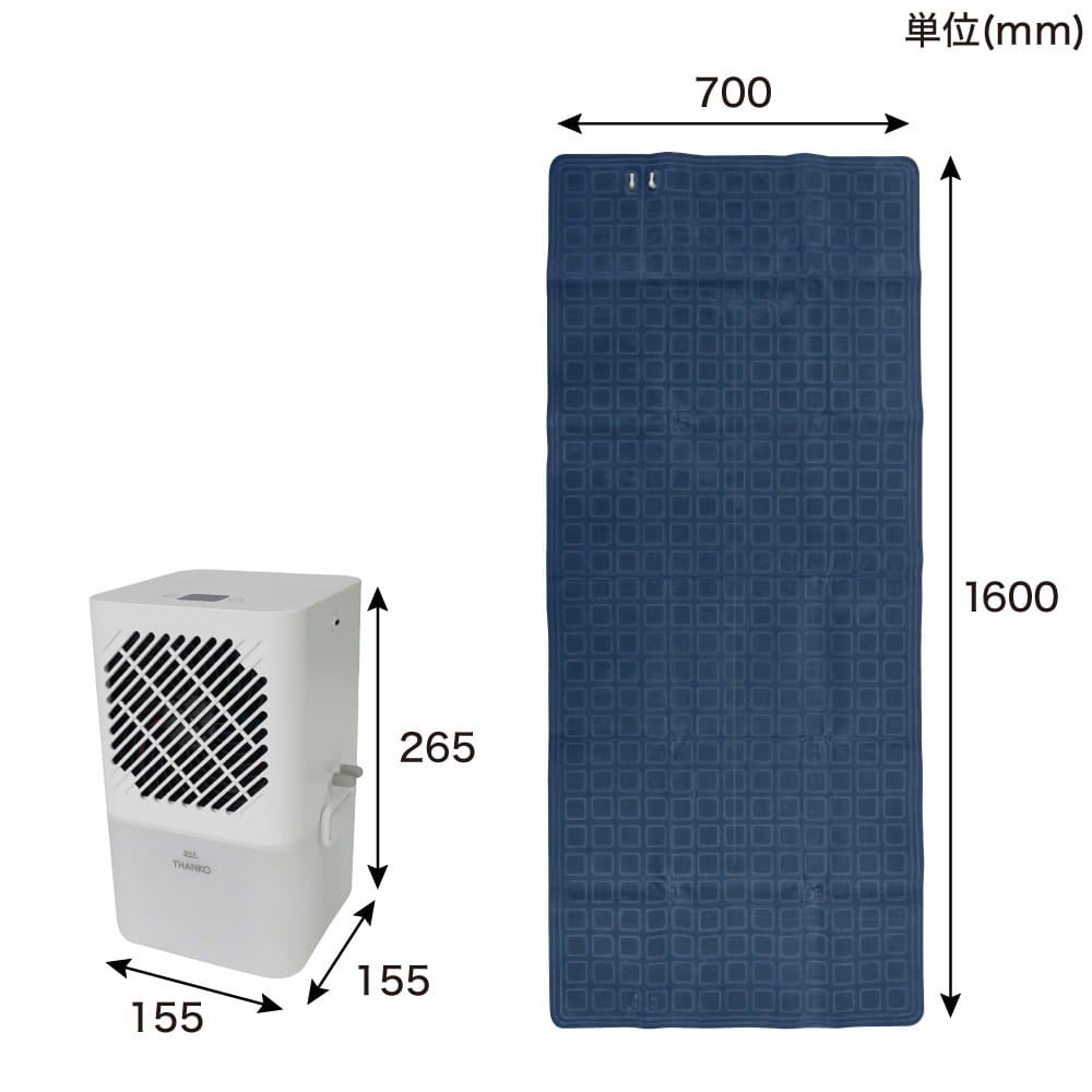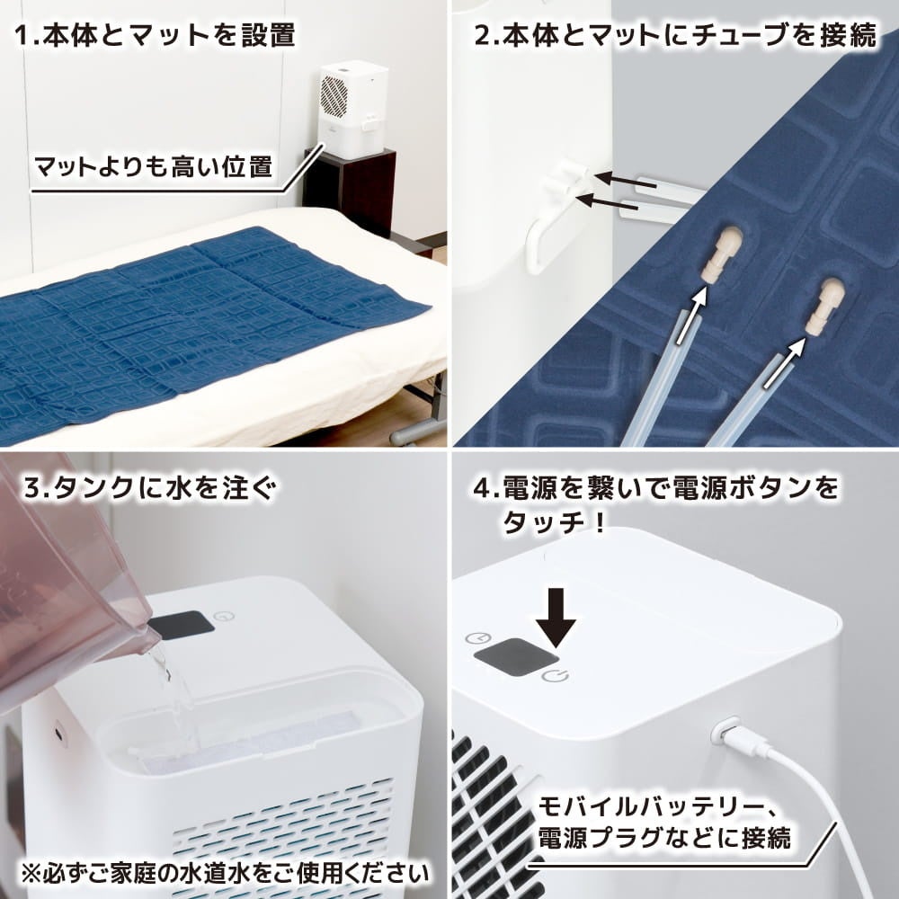 水が流れるマット(700x1600mm)をベッドや布団の上にセットし、水を循環させて冷やす水冷機(155×155×265mm)とマットを接続。