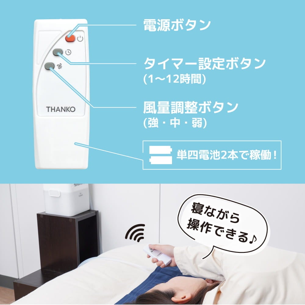 付属のリモコンで寝ながらでも操作でき、1〜12時間の切タイマー設定も可能です。