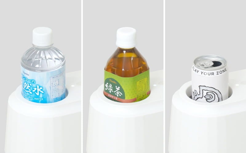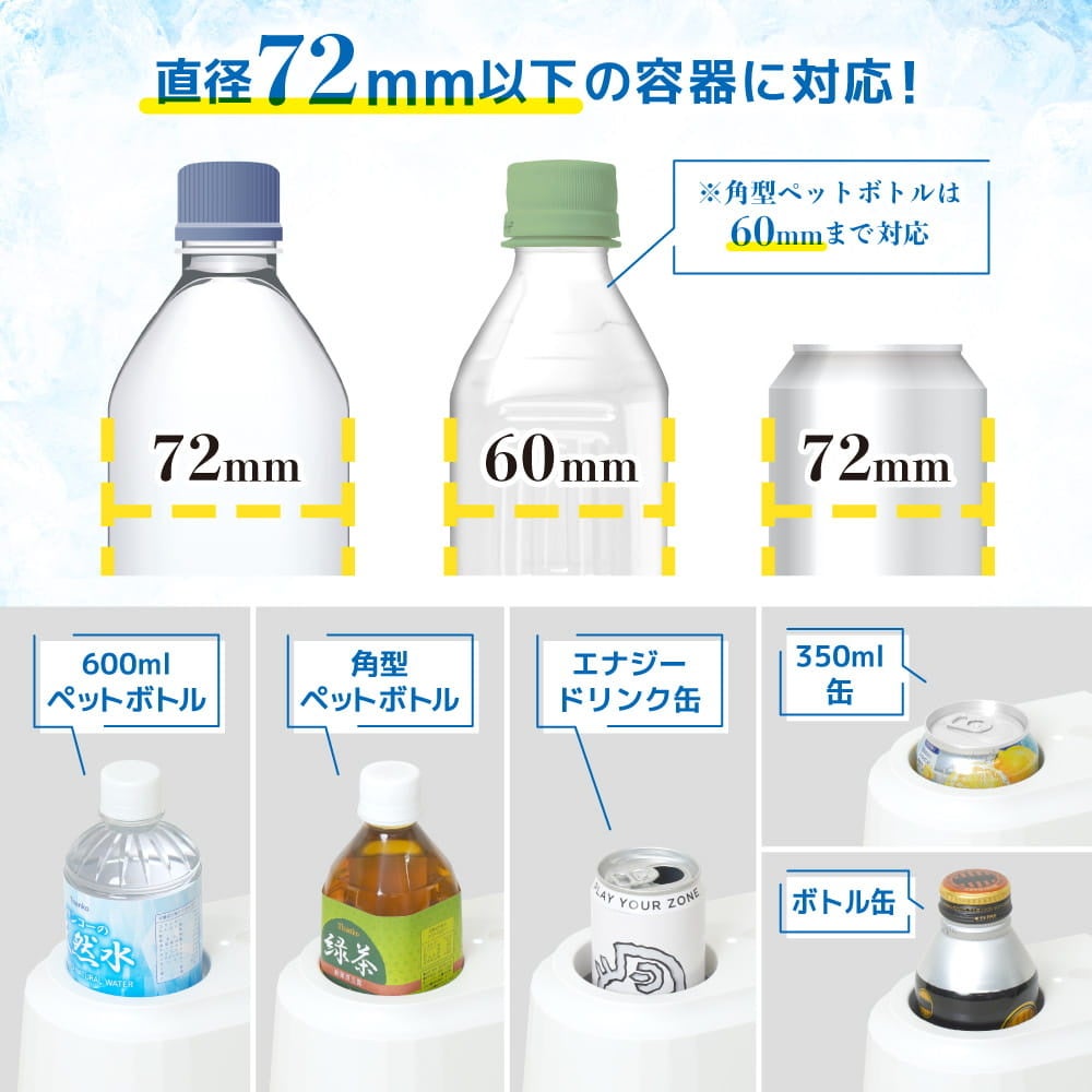 直径72mm以下の容器に対応し、600mlのペットボトルや缶、ボトル缶など幅広く使用可能。