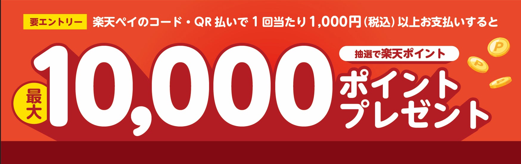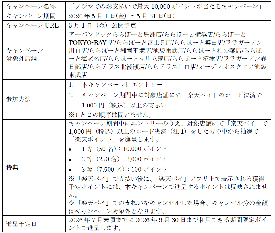 本導入を記念して、2026年5月1日(金)から5月31日(日)まで、「ノジマでのお支払いで最大10,000ポイントが当たるキャンペーン」を実施します。本キャンペーンでは、キャンペーン期間中に対象店舗(注3)にて「楽天ペイ」で1,000円(税込)以上の支払いをした方の中から、抽選で50名に「楽天ポイント」10,000ポイント、250名に「楽天ポイント」3,000ポイント、7,500名に「楽天ポイント」100ポイントを進呈(注4)します。
