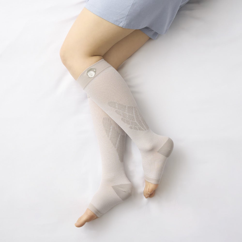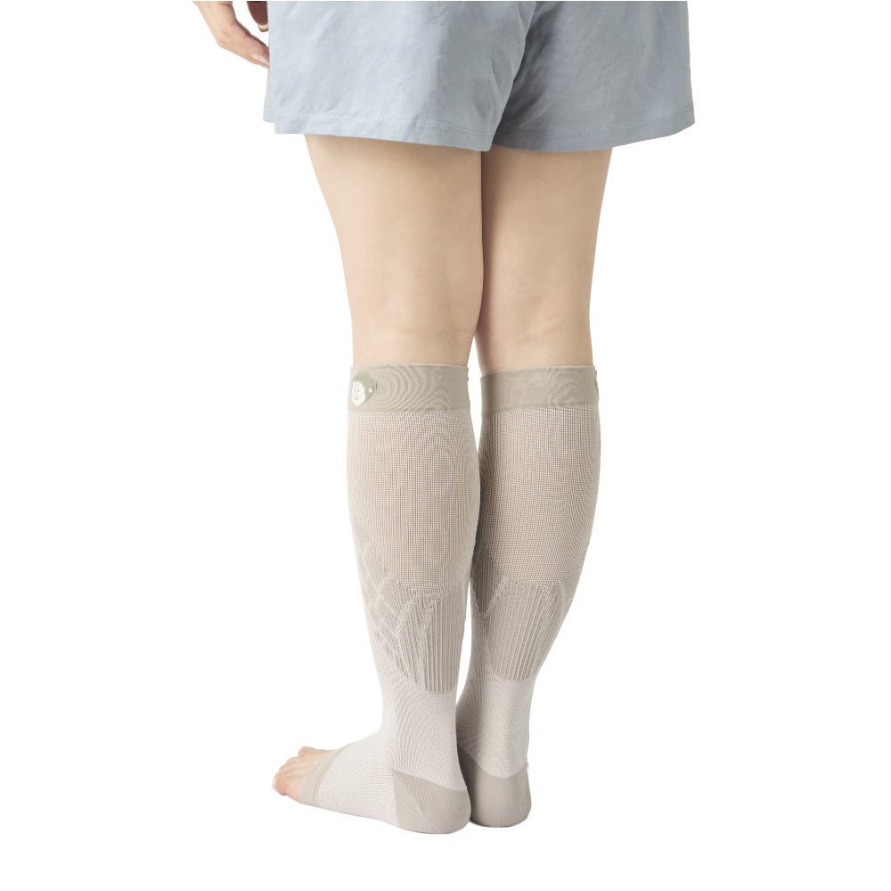 本体には、ひんやりとした肌触りの接触冷感素材を採用しています。さらに、熱を逃しやすい素材と通気性の良い編み方により、着圧設計でありながら蒸れにくく、快適な履き心地を実現しました。