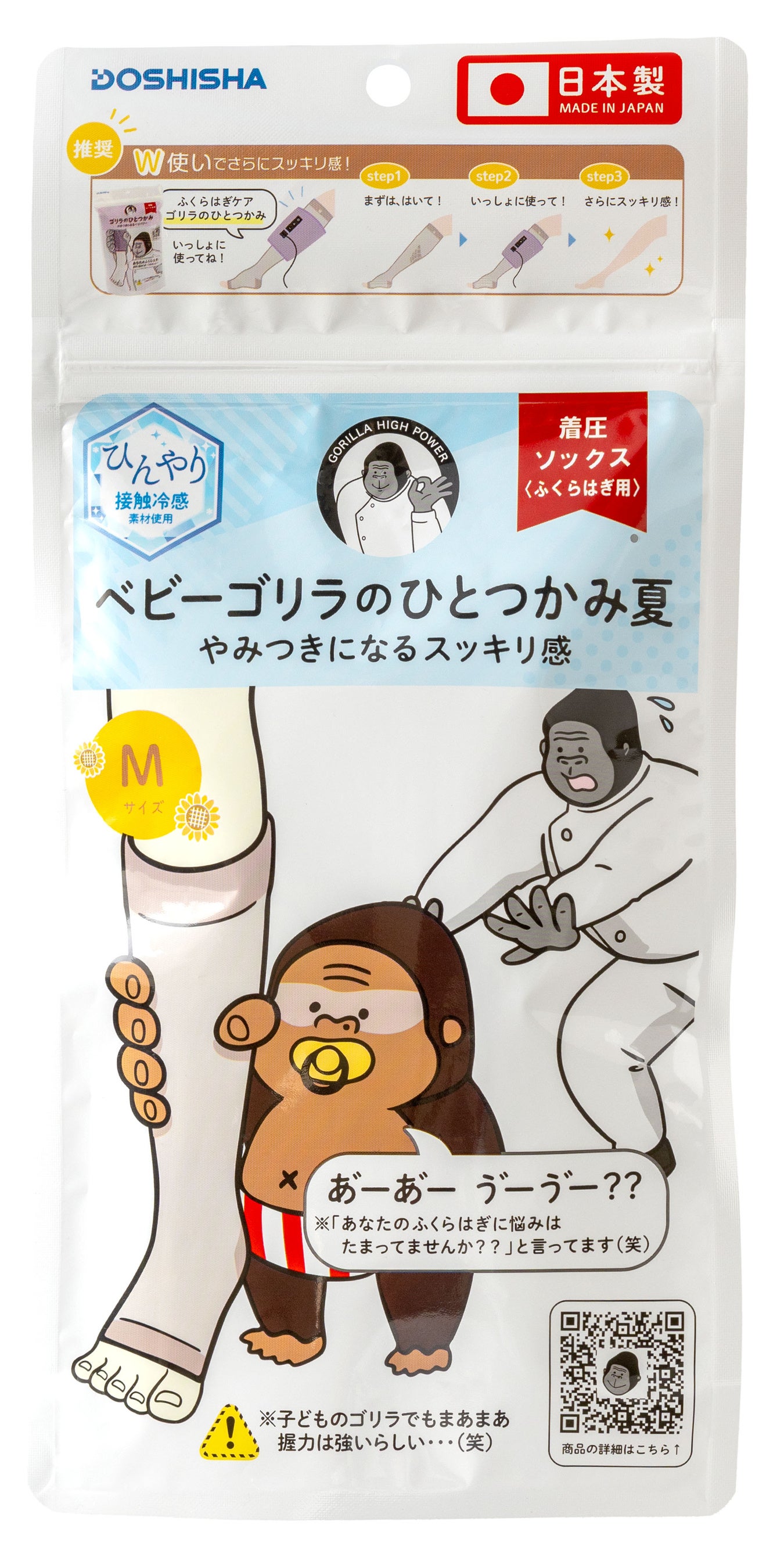 本製品は接触冷感素材と通気性に優れた編み方を採用することで、夏でも快適に着用できます。また、しっかりとした圧を感じながらも快適な履き心地を実現しました。夏らしくこんがり日焼けしたベビーゴリラのキャラクターをモチーフに“ゴリラのひと夏”と題し、夏を快適に過ごせるグッズを展開します。