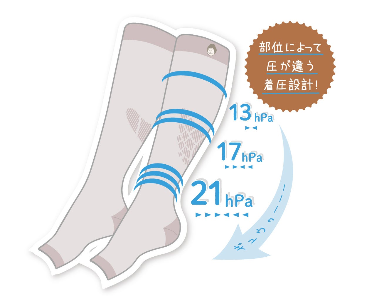 部位ごとに圧を変えた着圧設計になっています。足首に近い部分は21hPa、ふくらはぎ中央部は17hPa、膝に近い部分は13hPaと上から下にかけてより強い圧をかけています。これにより、脱いだ後のスッキリ感を演出しています。