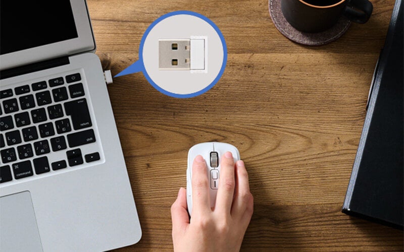 パソコンのUSB-Aポートにレシーバーを挿すだけの無線2.4GHz接続と、USB-Aポートのないパソコンやタブレットでも使えるBluetooth(R)接続の両方に対応するワイヤレスモデルです。