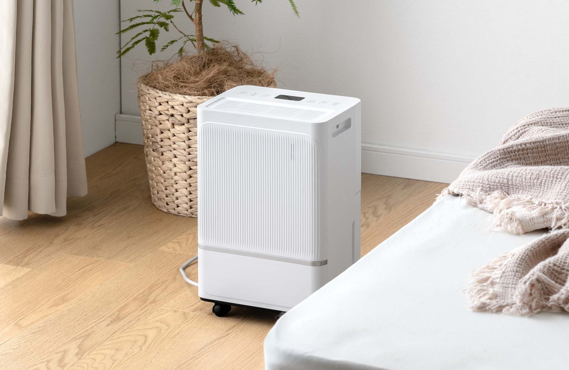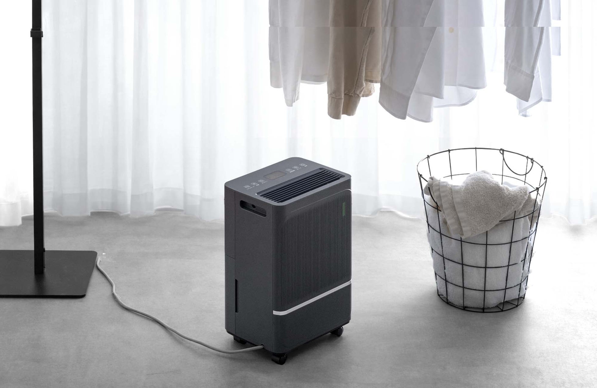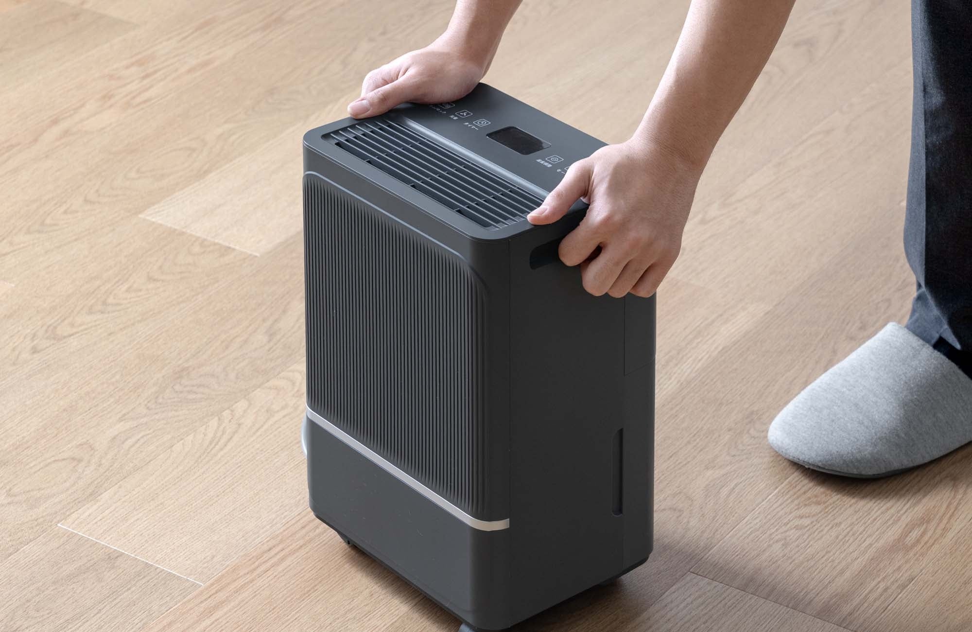 キャスターと引手付きで持ち運びも自在なため、日々の部屋干しや結露対策など、暮らしのあらゆるシーンをさらっと快適に整えます。また「衣類乾燥モード」や「スリープ機能」など、日常使いに便利な機能も搭載しています。