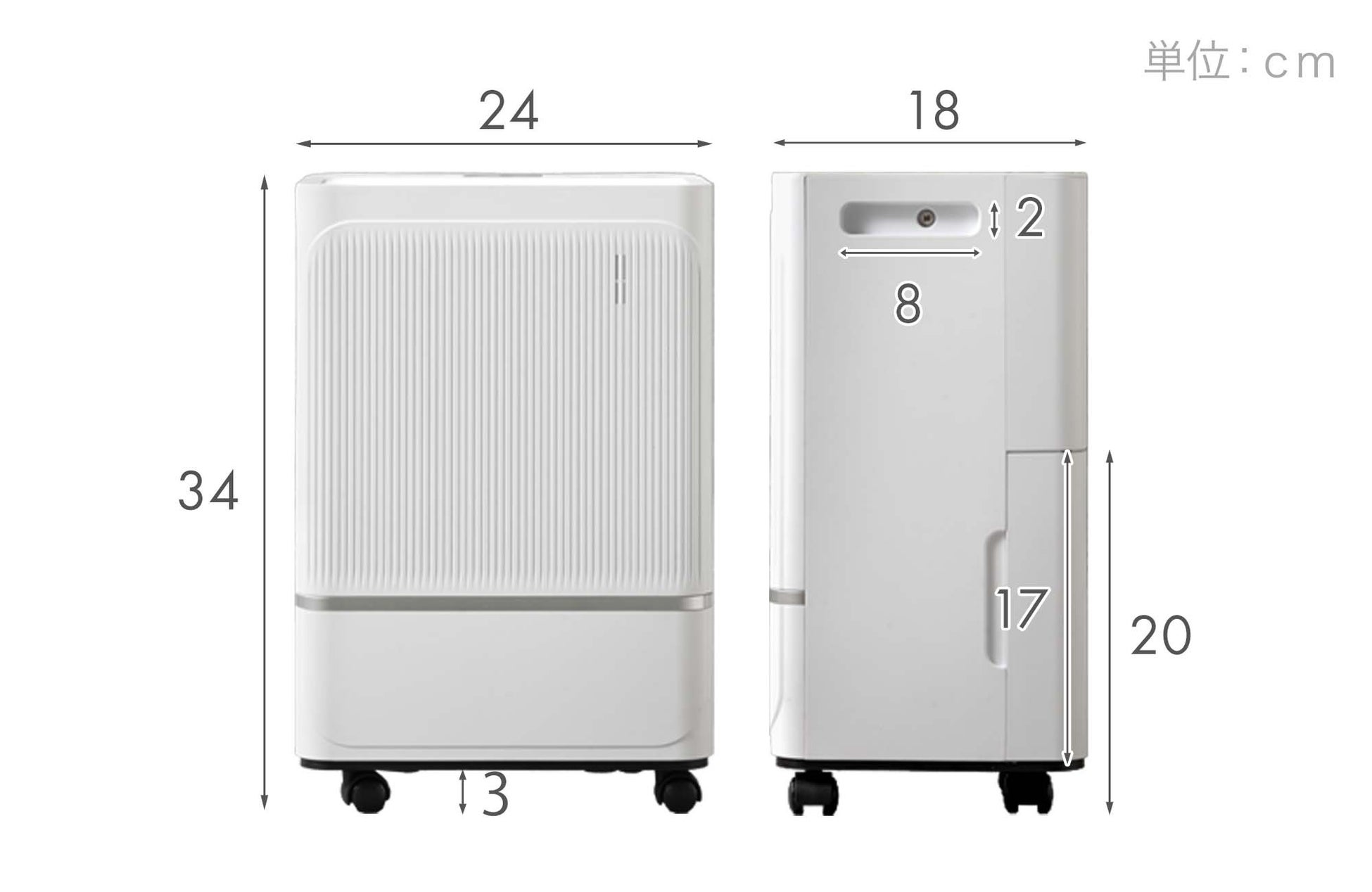 本製品は、幅24cm×奥行18cm×高さ34cmのコンパクトサイズを実現しました。設置面積を抑えた設計により、これまで除湿機の導入を諦めていた狭いスペースや、置き場所に悩むお部屋でも場所を選ばず設置が可能です。限られた住空間の“スぺパ”を最大化し、快適な空気環境を整えます。