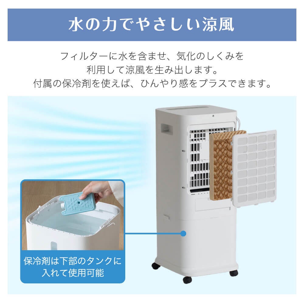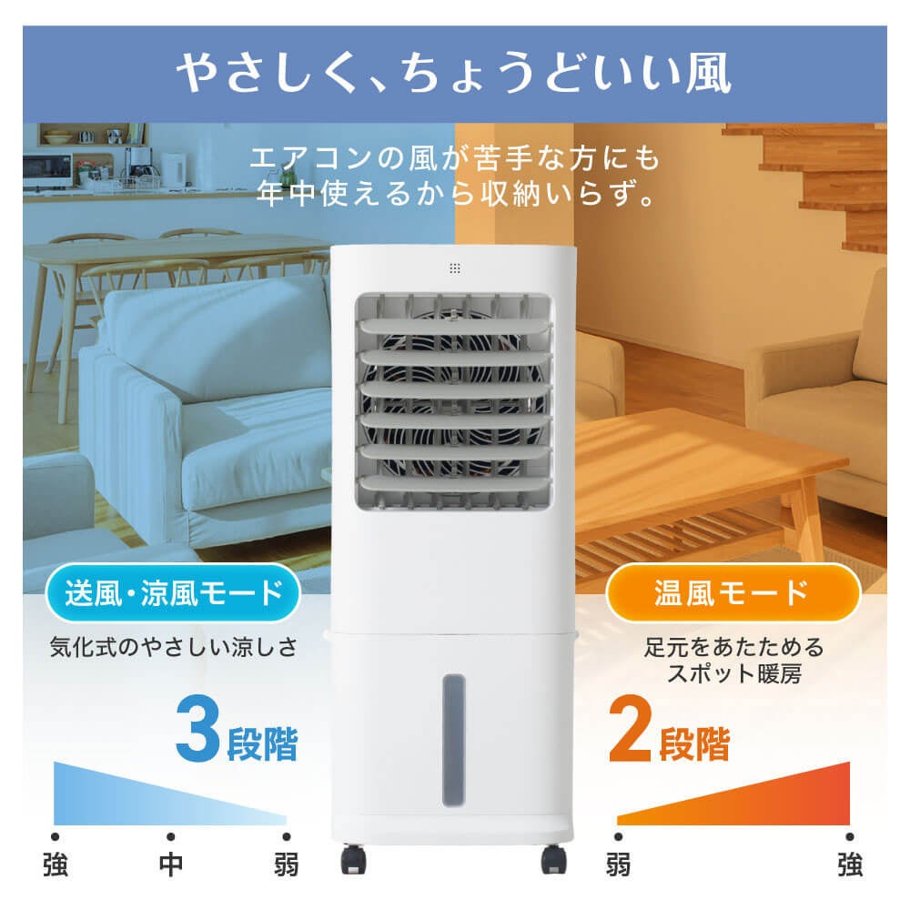 水の力でやさしい涼風、風量は送風・涼風3段階、温風2段階で調整可能