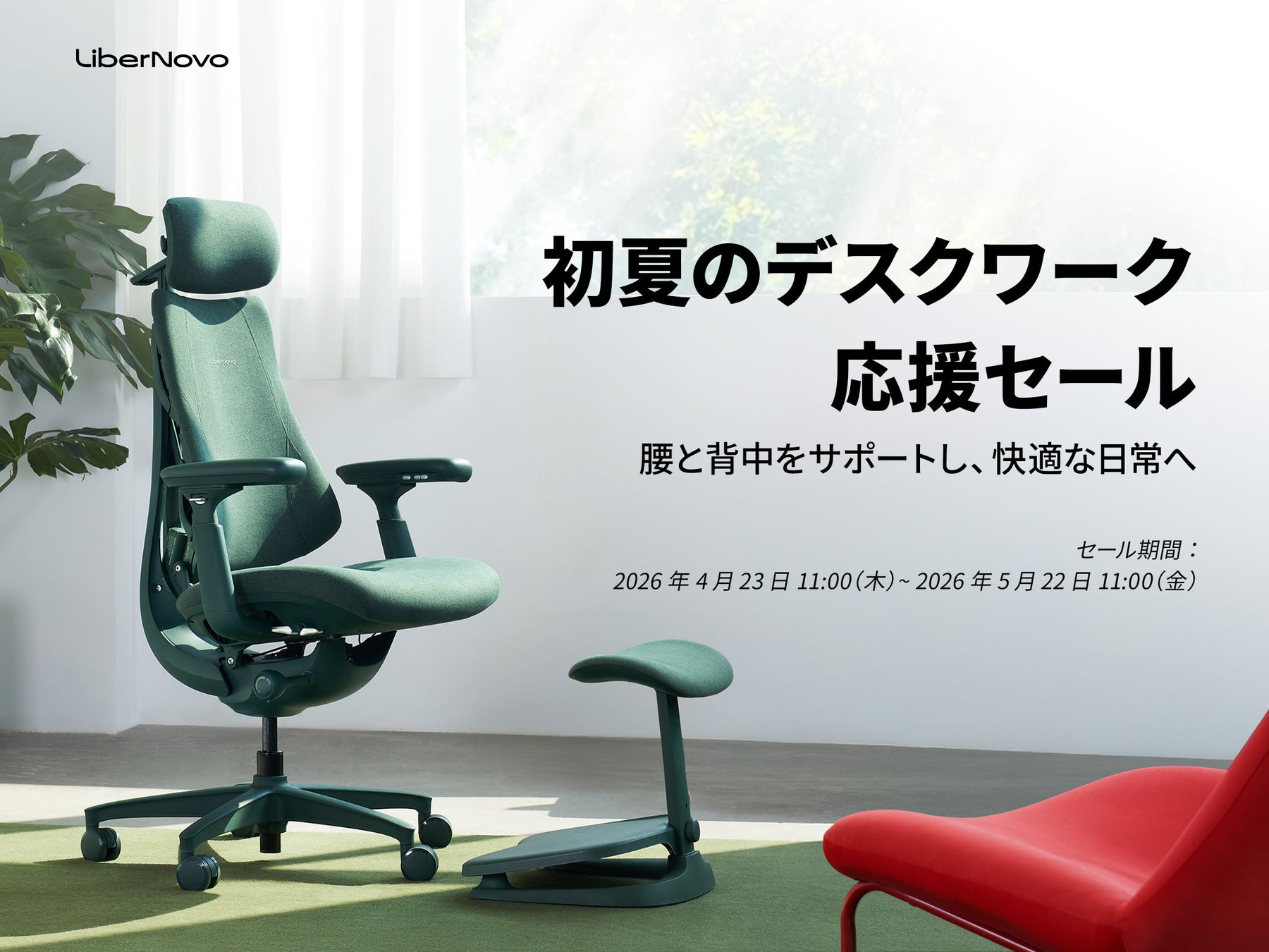 加えて、2026年4月23日(木)11:00 から2026年5月22日(金)11:00までの期間中、同社の電動ワークチェア 「LiberNovo Omni(リベルノヴォ オムニ)」がお得に購入できる「初夏のデスクワーク応援セール」を開催。期間中はLiberNovo Omni + フットレスト + 予備バッテリーがセットになった「プロセット」が通常価格の34% OFFになるほか、LiberNovo Omni単体でも28% OFFとなる123,300円(税込)で販売予定です。