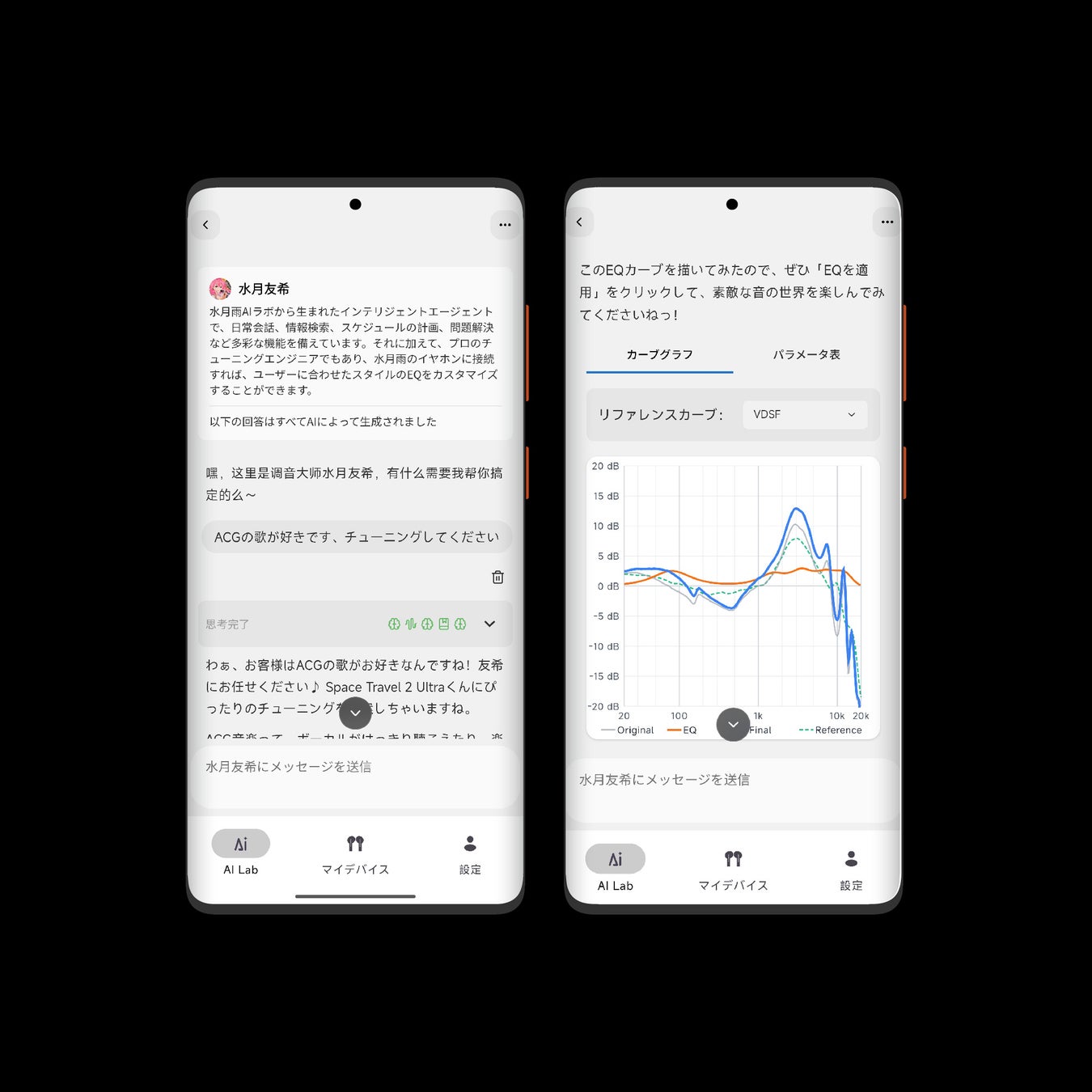 水月雨R&D AIチームが開発した「AI 水月友希 Beta0.1」を内蔵。膨大な音響知識を学習させたAIが、言葉で伝えたチューニングや設定の希望をそのまま反映。さらに、再生中の楽曲に合わせて最適なサウンドスタイルへ自動で調整します。