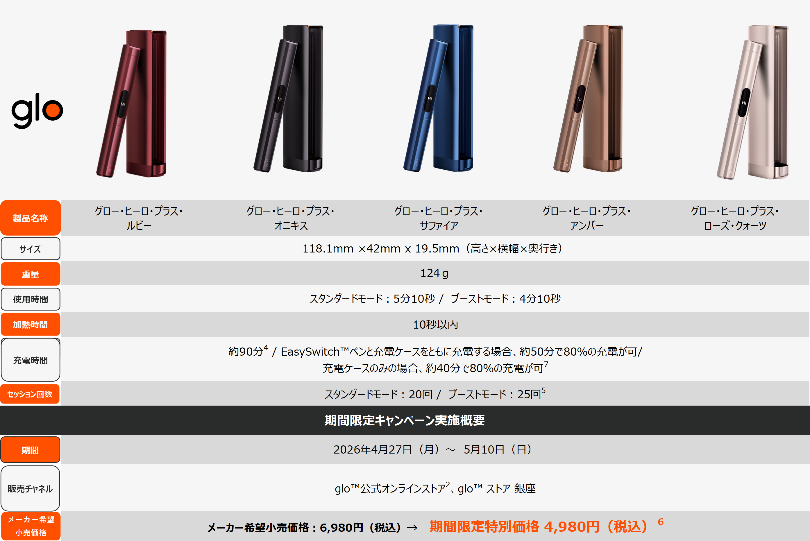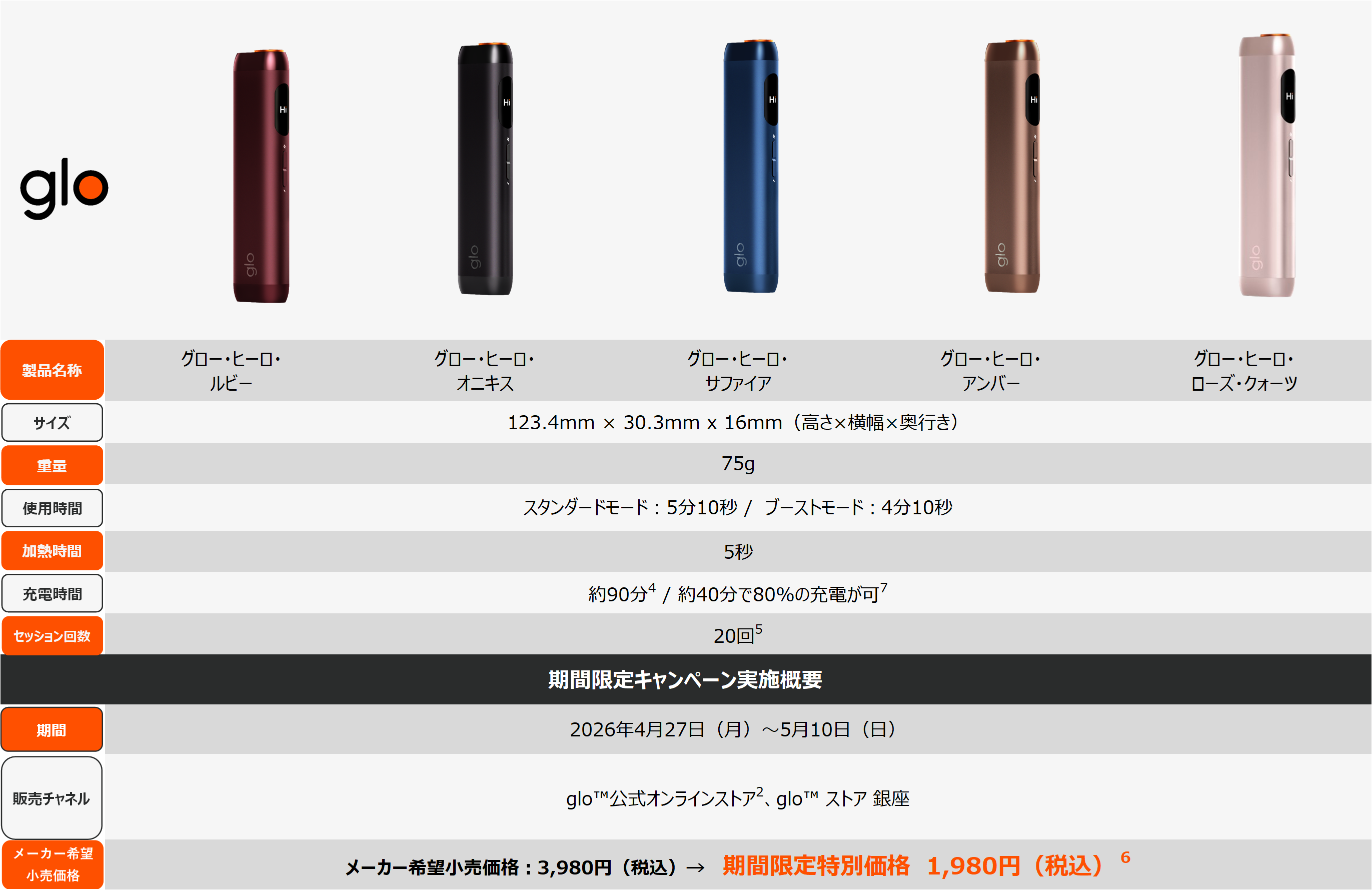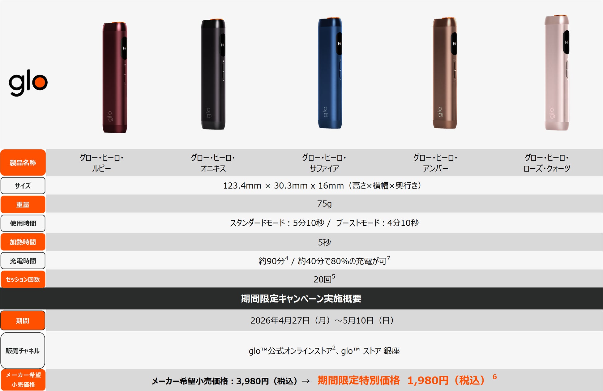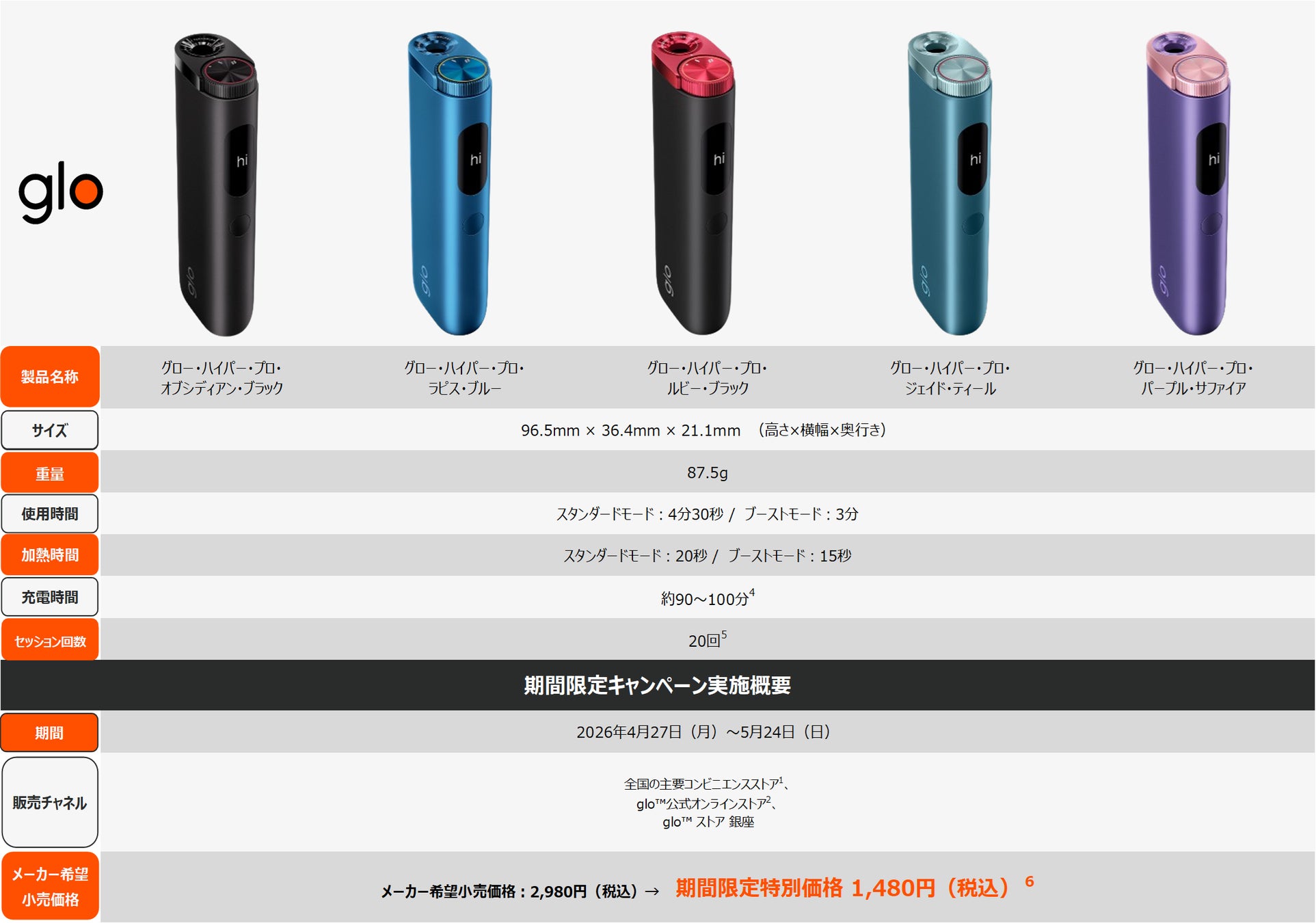 ブリティッシュ・アメリカン・タバコ・ジャパン合同会社(本社:東京都港区、代表:マウリシオ・ララ、以下「BATジャパン」)は、2026年4月27日(月)から5月24日(日)までの期間、加熱式たばこデバイス「glo™ Hyper Pro(グロー・ハイパー・プロ)」の全5カラーを対象に、期間限定の特別価格1,480円(税込)で販売するキャンペーンを実施します。