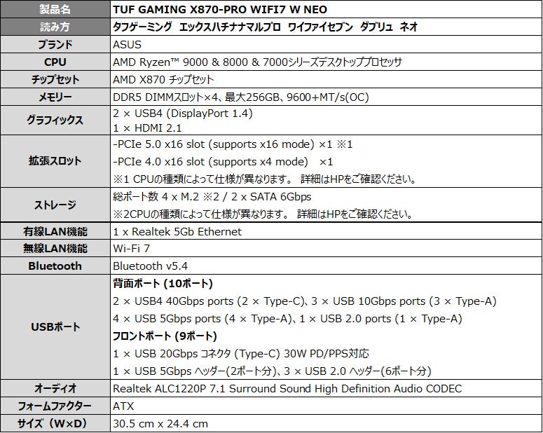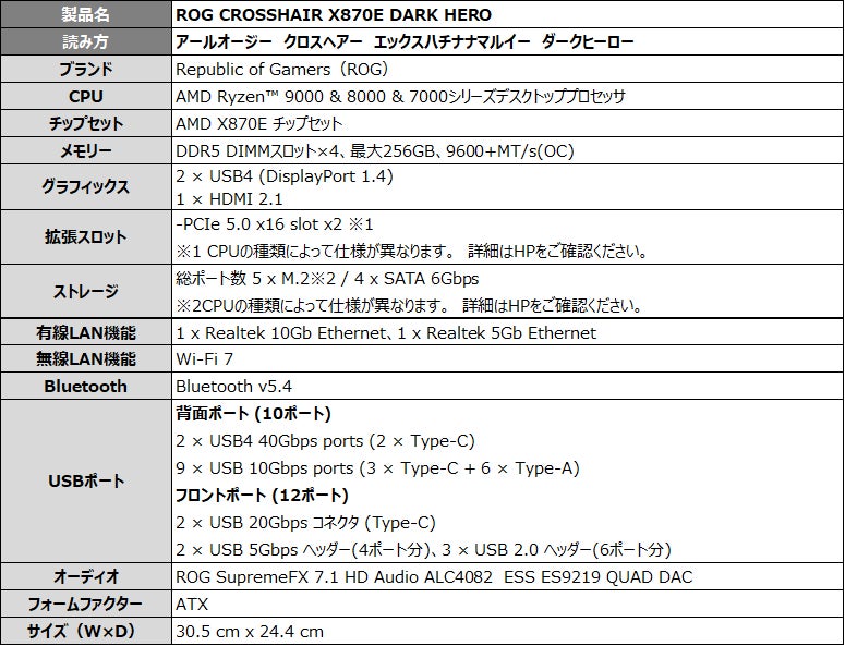 ASUS JAPAN株式会社は、ゲーミングブランドRepublic of Gamersより、AIO Qコネクタを搭載したAMD AM5 ソケットX870Eチップセットのマザーボード「ROG CROSSHAIR X870E DARK HERO」、ホワイト基板のTUF Gamingマザーボード「TUF GAMING X870-PRO WIFI7 W NEO」、B650チップセットのMicroATXマザーボード「TUF GAMING B650EM-E WIFI」の3モデルを発表しました。2026年4月24日(金)より販売開始します。
