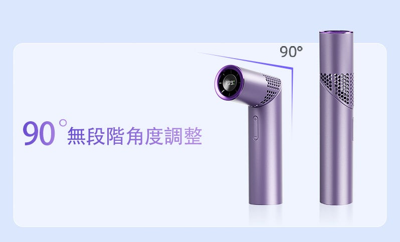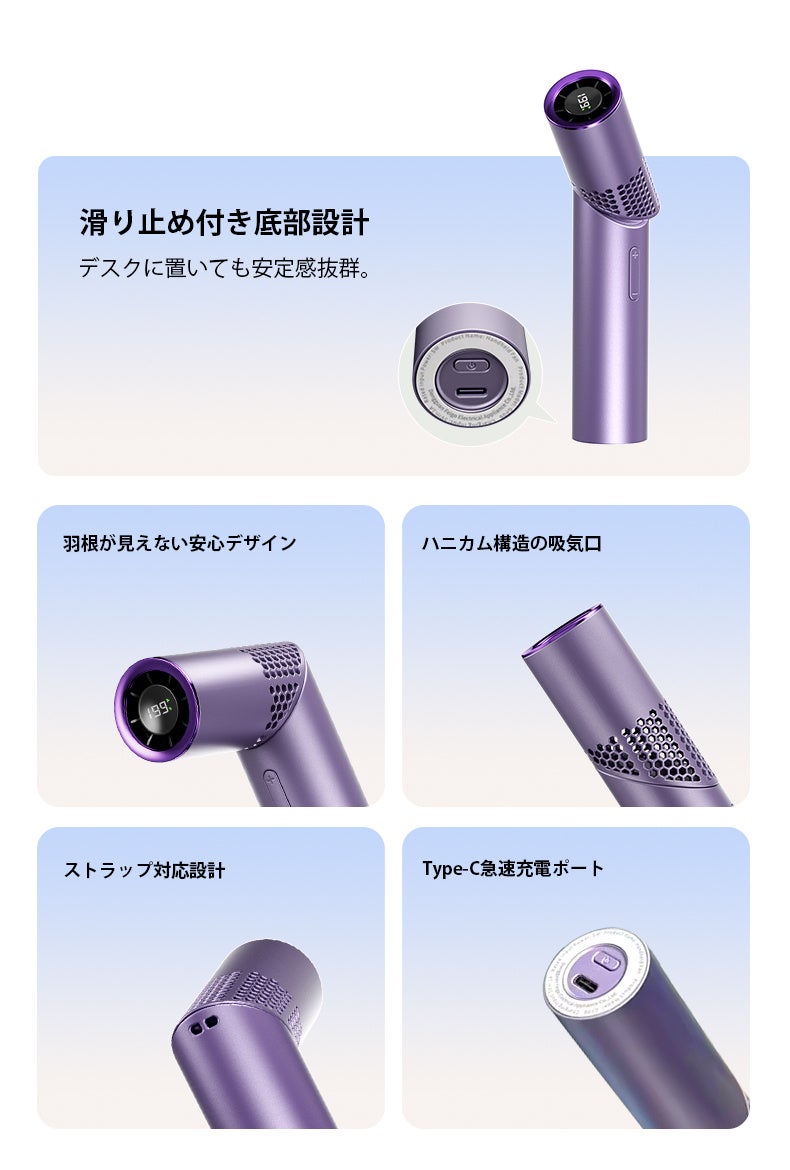 「LIP FAN」はまるでリップのように、ポケットにもバッグにもすっと収まる。さらに、90°無段階の角度調整に対応。卓上でも、手持ちでも、シーンに合わせて“ちょうどいい風”を届けます。そして、隠し羽根デザインを採用し、最大20,000RPMの高速回転と、最大風速13m/sのパワフルな送風を実現。コンパクトな見た目からは想像できない、驚きの風力。
