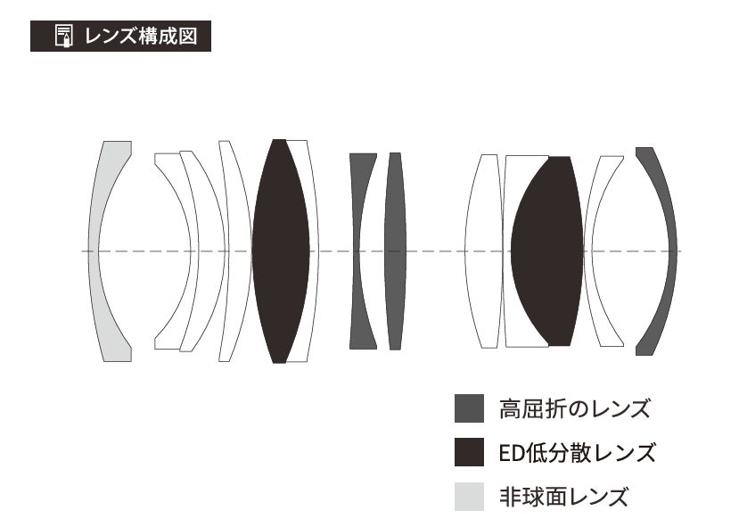・EDレンズ2枚、高屈折率レンズ3枚、非球面レンズ1枚を採用