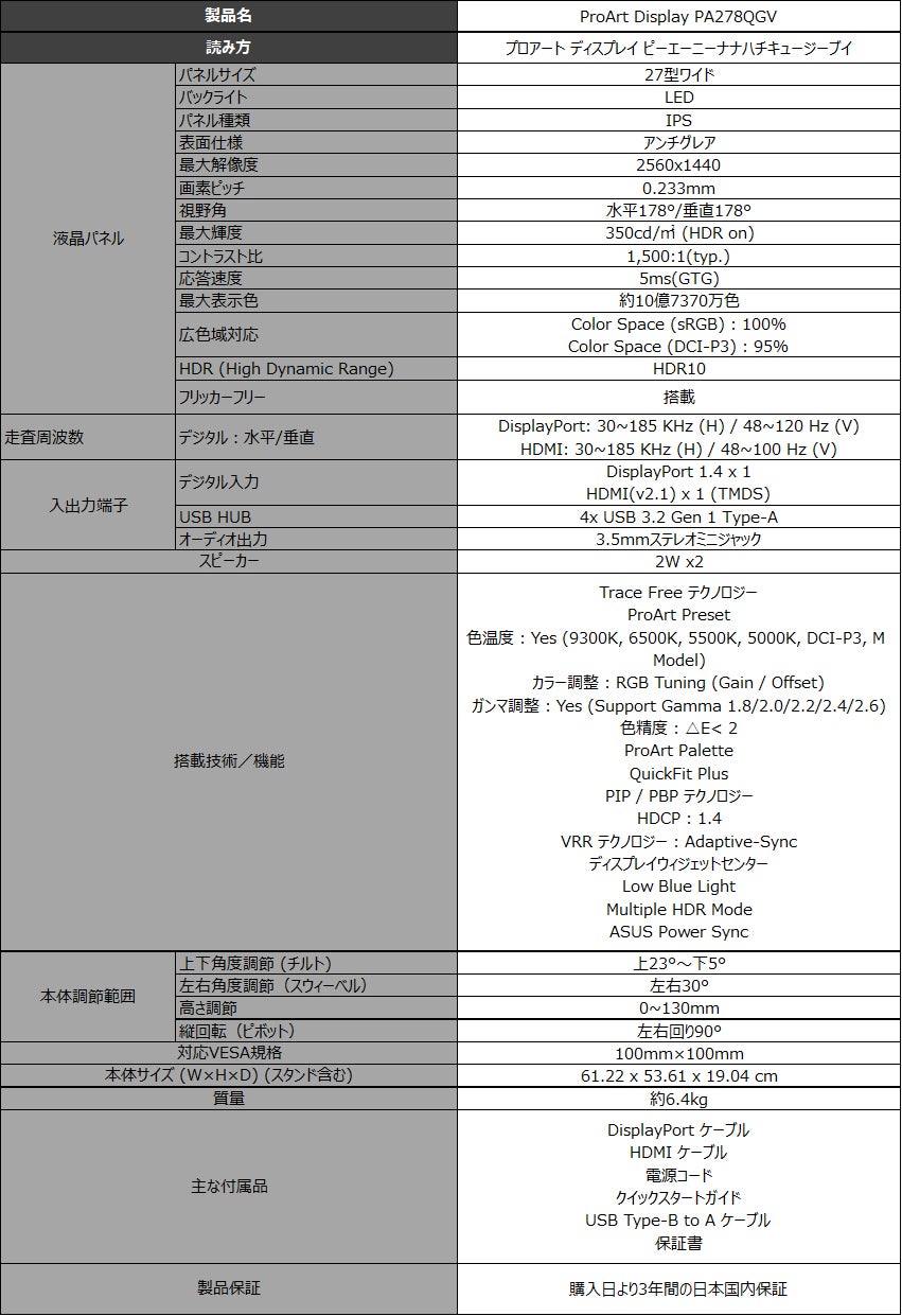 ProArt Display PA278QGV:https://www.asus.com/jp/displays-desktops/monitors/proart/proart-display-pa278qv-gen2-pa278qgv/