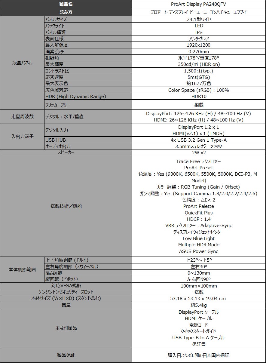 ProArt Display PA248QFV:https://www.asus.com/jp/displays-desktops/monitors/proart/proart-display-pa248qv-gen2-pa248qfv/