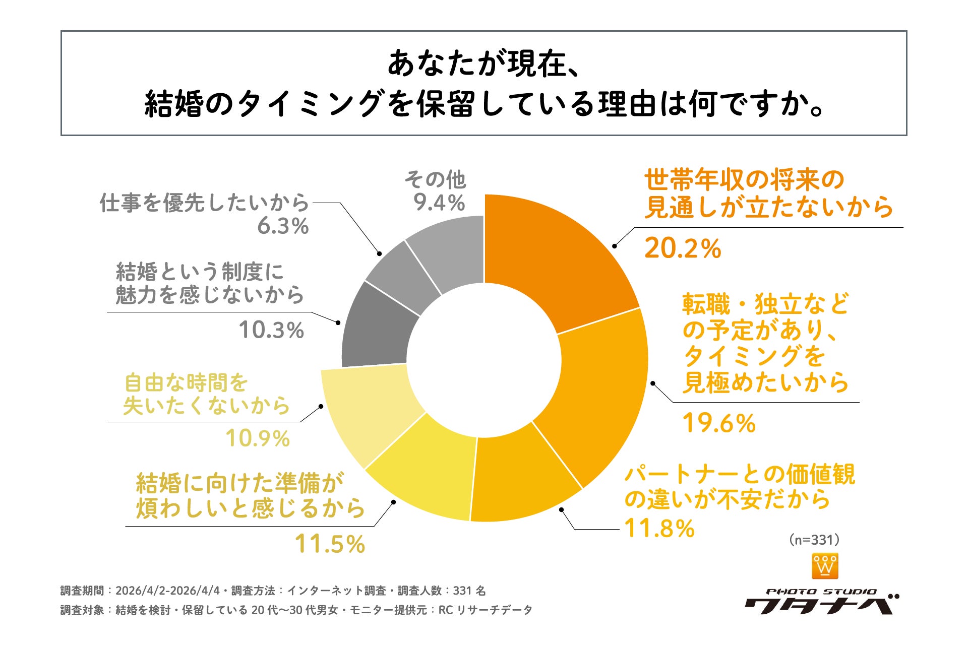 少子化や未婚率の上昇が国を挙げて取り組むべき課題となる中、若年層が結婚を踏みとどまる背景に大きな関心が集まっています。特に、物価高や共働きが前提となる現代において、将来の世帯年収に対する経済的な不安や、従来の形式的な結婚への負担感が、若年層の結婚観に変化をもたらしています。結婚を望みながらも決断を保留している層が、どのような要因で立ち止まり、どのような条件があれば一歩を踏み出せるのかを紐解くことは、多様化する現代のライフスタイルを理解する上で重要です。しかし、当事者が抱えるリアルな不安や、結婚の決断に踏み切るための後押しとなる条件を示すデータは不足しています。そこで、フォトスタジオワタナベ(渡辺写真館)は、結婚を検討・保留している20代~30代の男女を対象に、「若年層の結婚意思決定要因に関する調査」を実施しました。