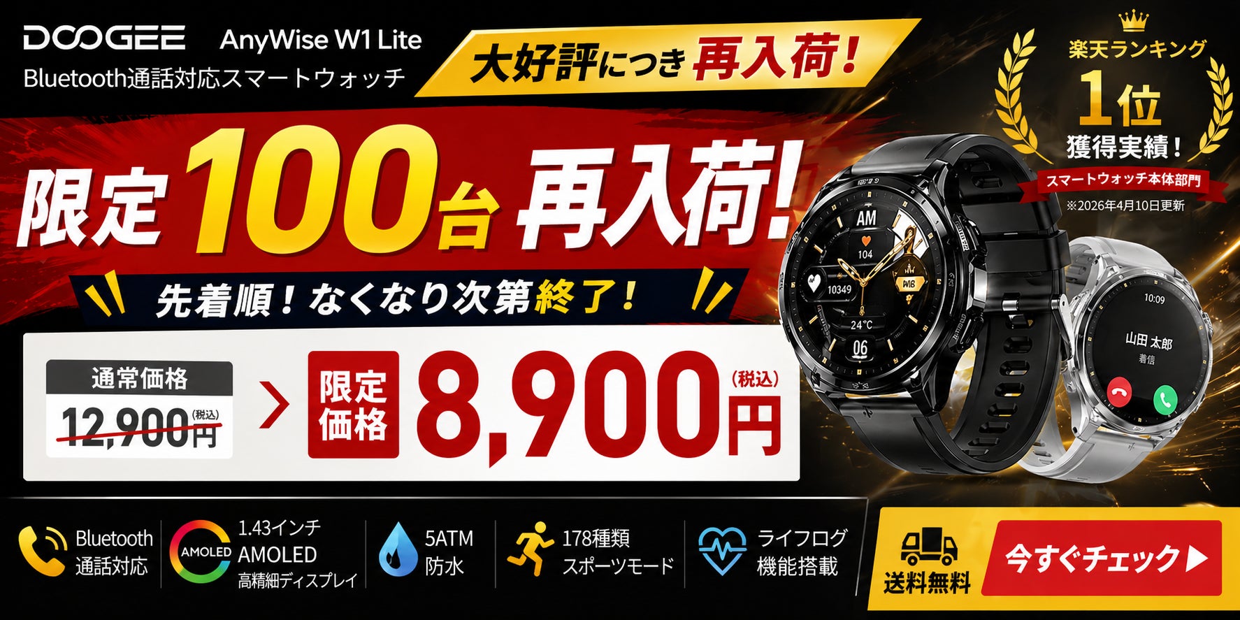 発売後即ヒットで一時完売。Bluetooth通話・5ATM防水搭載の話題モデルが数量限定で再販開始、先着100台の特別セール実施