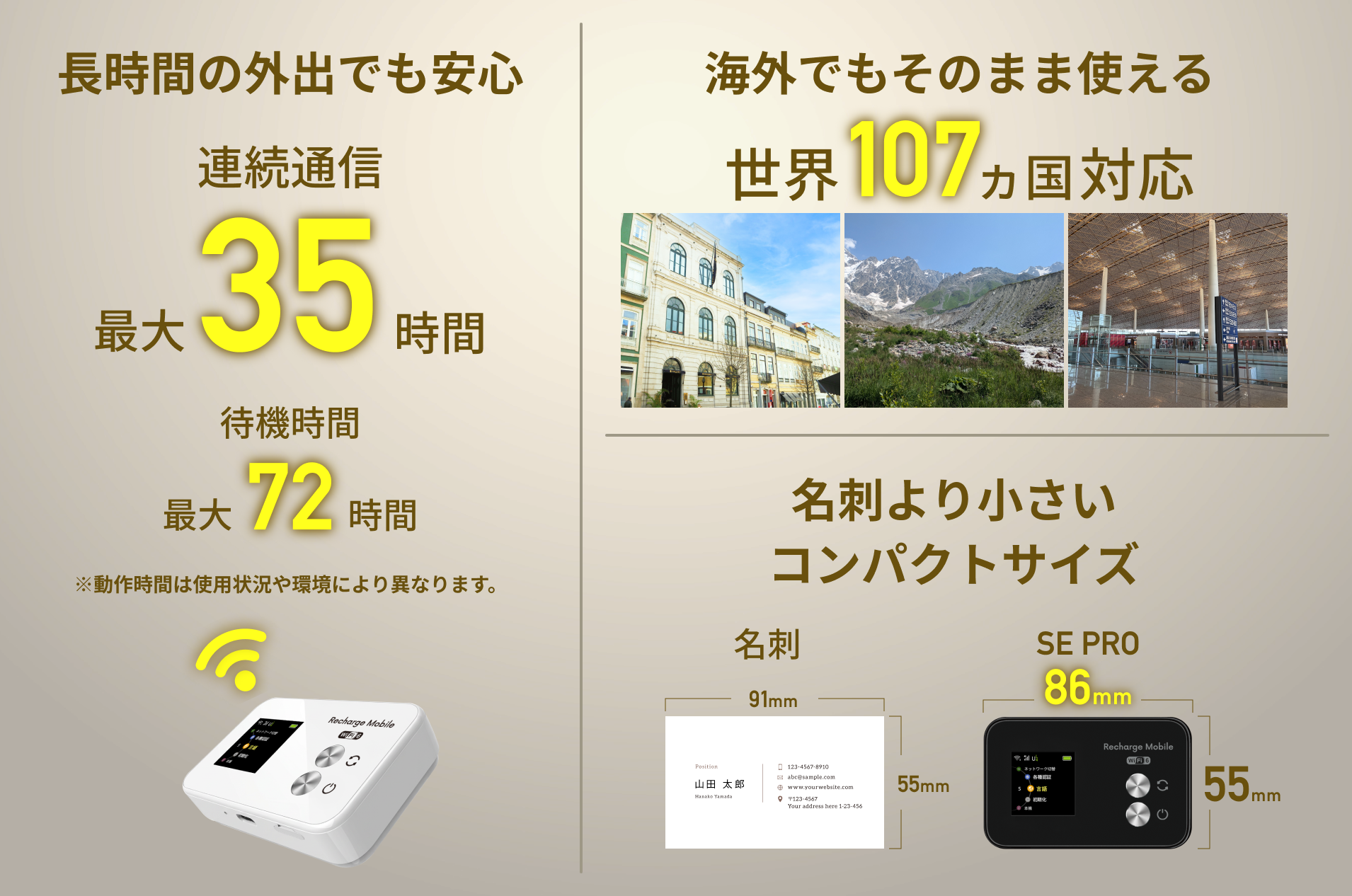 本製品は、初回最大100GB(有効期限最大365日)のデータ容量がセットとなり、国内主要3キャリア(docomo/au/Softbank)への自動接続、世界107ヵ国対応、最大約35時間の長時間駆動を備えた新モデルです。
