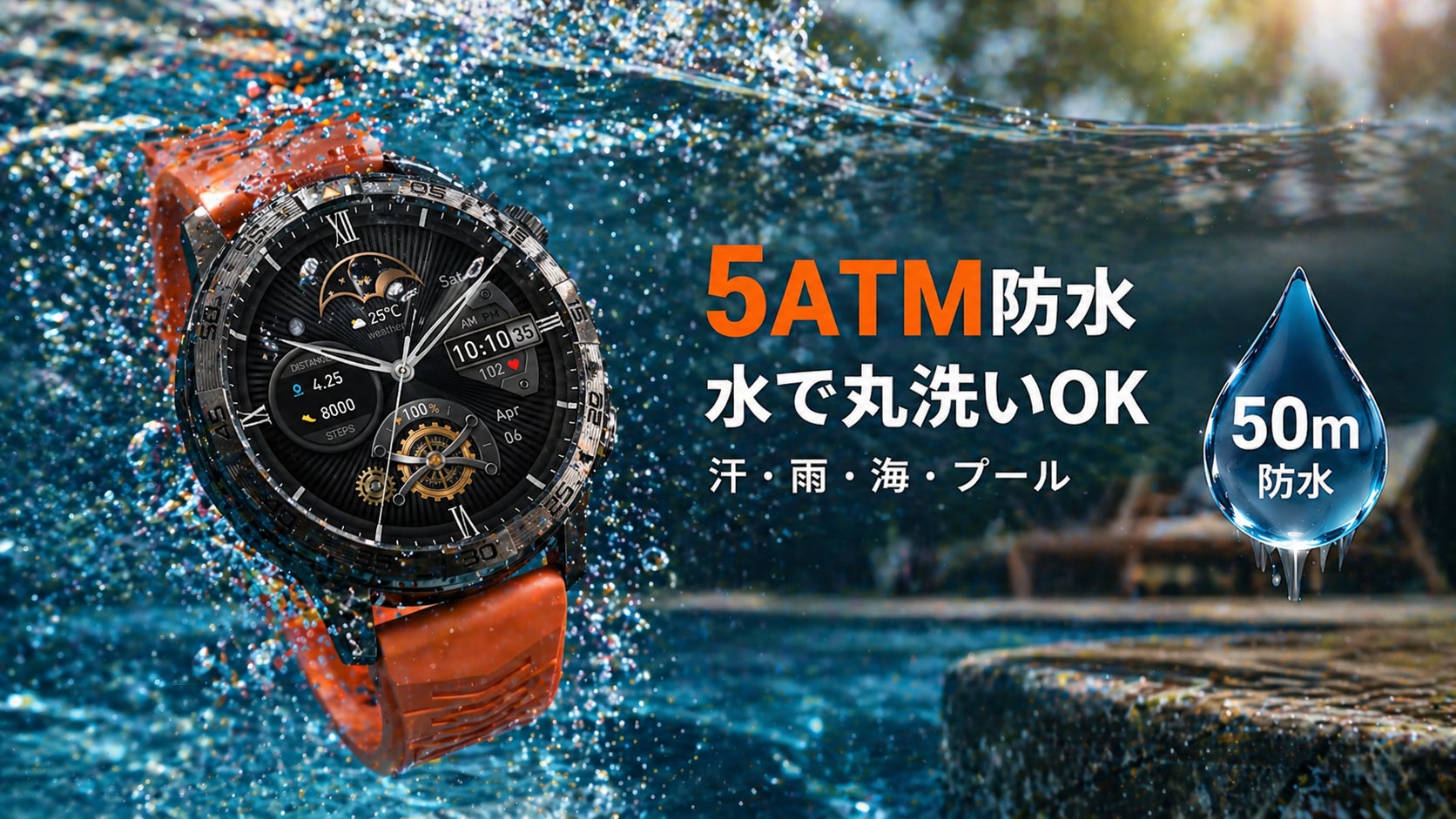 50m防水(5ATM)対応で、海水浴・プール・突然の雨でも安心。付属のシリコンバンドは汗や汚れに強く、水洗いで清潔を保てます。